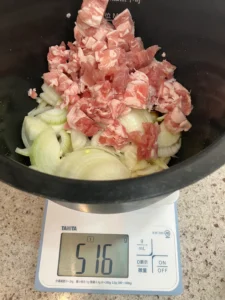 - 鍋に調味料・玉ねぎ・豚肉を入れて、混ぜ合わせる。